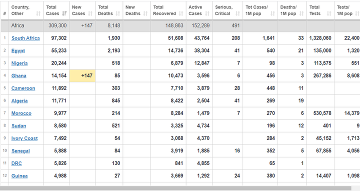 Africa has so far recorded 309, 330 cases, 8,148 total deaths, 148, 863 recoveries and battling with 152,289 active cases.