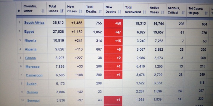 It is important to know that Africa in general has recorded 159,701 total cases with 4,511 total death, 68,882 recoveries and managing 86,308 active cases. Egypt has recorded the highest death toll in Africa.