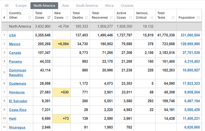 The United States Of America, USA is the most hit country with 3,355,646 cases, 1,490,446 recovery and 137,403 deaths. Brazil is the second most hit with 1,840,812 cases with 1,213,512 recovery and death toll hits 71,492.
