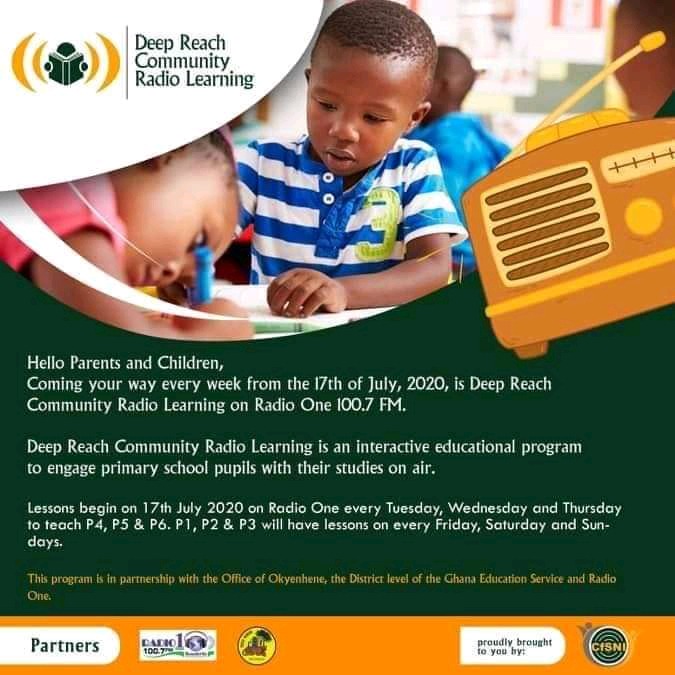 With effects from Friday 17th July 2020, a non profitable non- governmental organisation (NGO), Care for Society Network International (CfSNI) in partnership with the office of the Okyenehene, paramount Chief of Akyem Abuakwa Traditional Area, the district and municipal levels of the Ghana Education Service and Radio 1, 100.7fm introduce radio learning for the basic school pupils, dubbed “Deep Reach Community Radio Learning”.