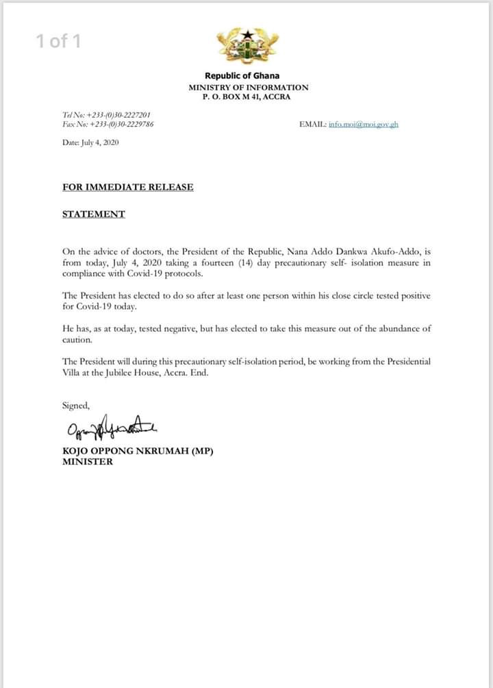 “On the advice of doctors, the president of the republic, Nana Addo Dankwa Akufo-Addo, is from today July 4 2020, taking a fourteen (14) day precautionary self isolation measure in compliance with Covid-19 protocols. The president has elected to do so after at least one person within his close circle tested positive for Covid-19 today.” – the letter reads.