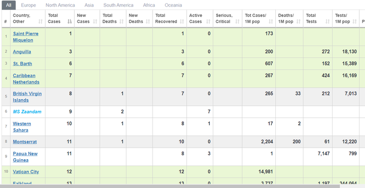 3. Saint Barthélemy also has all 6 cases recovered.First two cases were confirmed on March 16 2020. Saint Barthelemy, is a French-speaking Caribbean island commonly known as St. Barts, it is known for its white-sand beaches and designer shops.