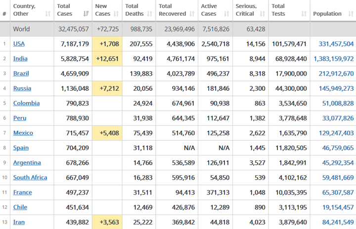 Globally, the world has recorded 32,475,057 cases with 23,969,496 recoveries while a total of 988,735 souls are killed. Battling with 7,516,826 active cases, the globe has a total of 63,428 patients in critical or serious conditions.