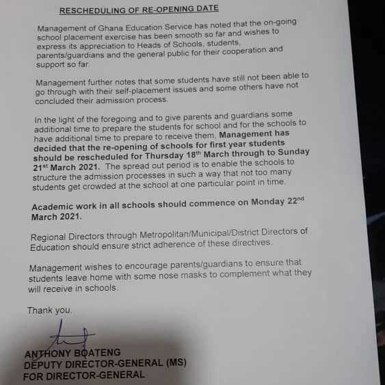 GES Postpones Reopening Date For First-Year SHS Students