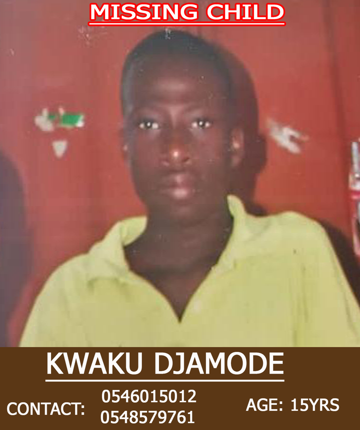 Kwaku Djamode is very calm and dark in complexion. He is said to have left home in white top and jersey shorts and with a school bag.