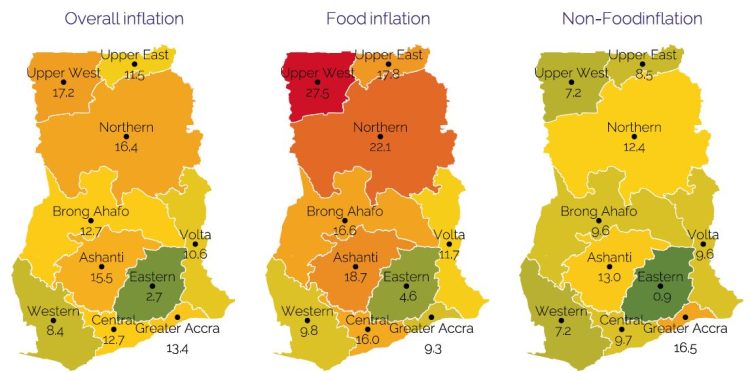 At the regional level, the overall year-on-year inflation ranged from 2.7% in the Eastern Region to 17.2% in the Upper West Region. Greater Accra Region recorded the highest month on month inflation (2.0%). All regions recorded positive month-on-month inflation rates with the Upper East region recording the lowest (0.3%).