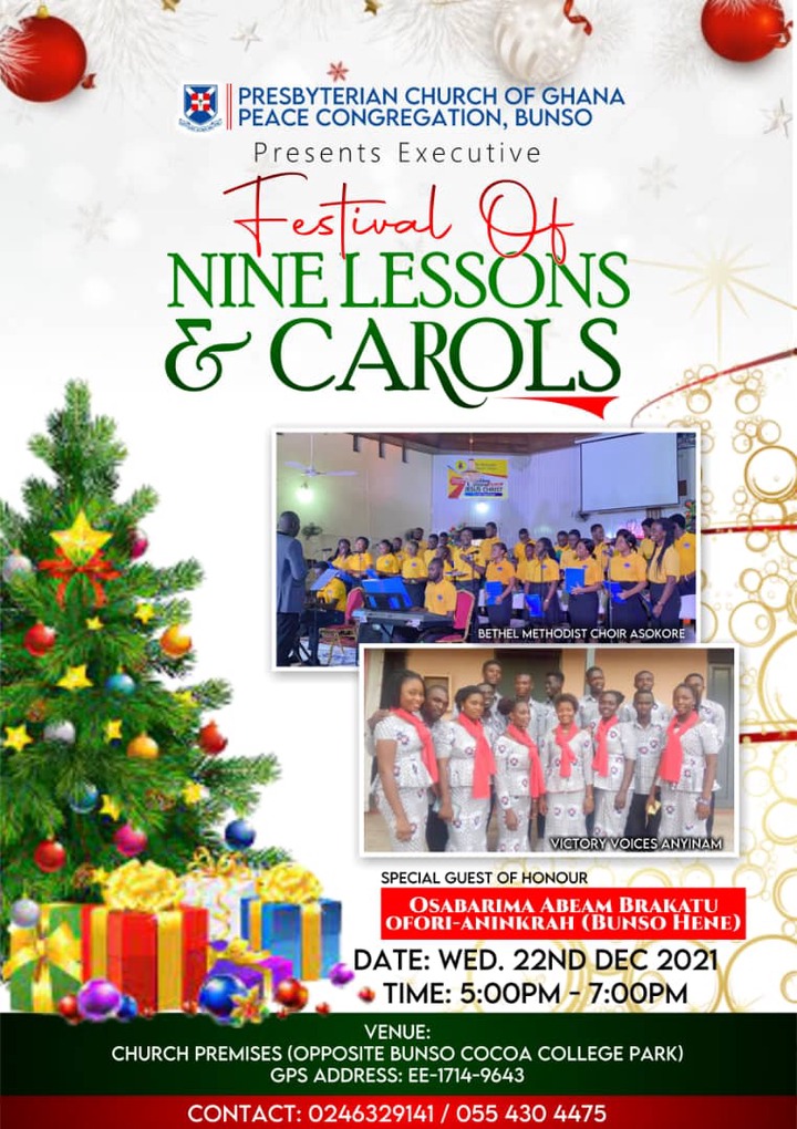 As part of activities in the Christmas season, the Presbyterian Church Ghana, Peace Congregation – Bunso in the Abuakwa South municipality in the eastern region is organizing a nine festival of Nine Lessons and Carol at the church’s premises.