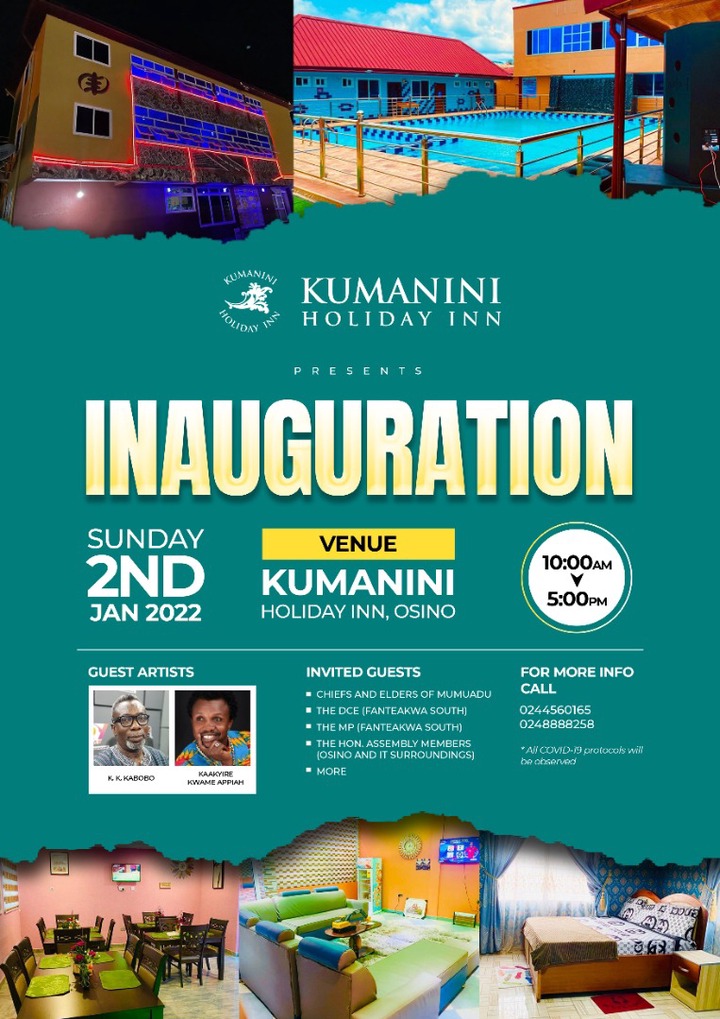 The legendary High-life duo, Kaakyire Kwame Appiah and K. K. Kaboobo are set to storm the inauguration of Kumanini Holiday Inn at Osino in the fanteakwa South district in the eastern region.