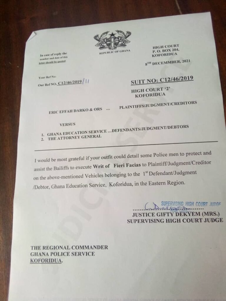 “I would be most grateful if your outfit could detail some police men to protect and assist the bailiffs to execute Writ of Fieri Facias to plaintiff/judgment/creditor on the above-mentioned vehicles belonging to the 1st Defendant/judgment/Debtor, Ghana Education Service, Koforidua, Eastern Region.”