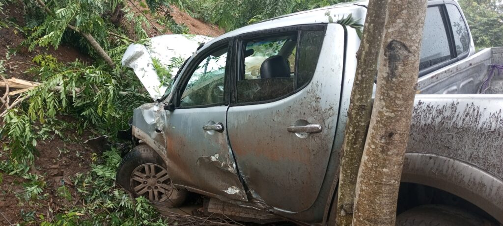 A Mitsubishi 4 Wheel drive with a registration number GE 7823 – 13 en route from Kumasi to Accra fails break, skids off the road and driver severely injured.