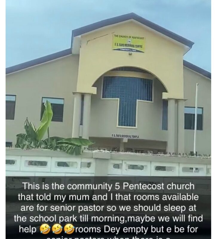“This is the community 5 Pentecost church that told my mum and me that rooms available are for senior pastors so we should sleep at the school park till morning, maybe we will find help 2 rooms Dey empty but e be for senior pastors when there is a Convention,” Criss Waddle said.