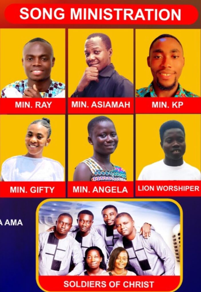 The ministers include but not limited to; Minister Ray, Minister Asiamah, Minister Lion Worshipper, Minister Angela, Minister Osei, Minister Oheneba KP, Minister Gifty, Minister Hannah and the talented group; Soldiers of Christ. etc.