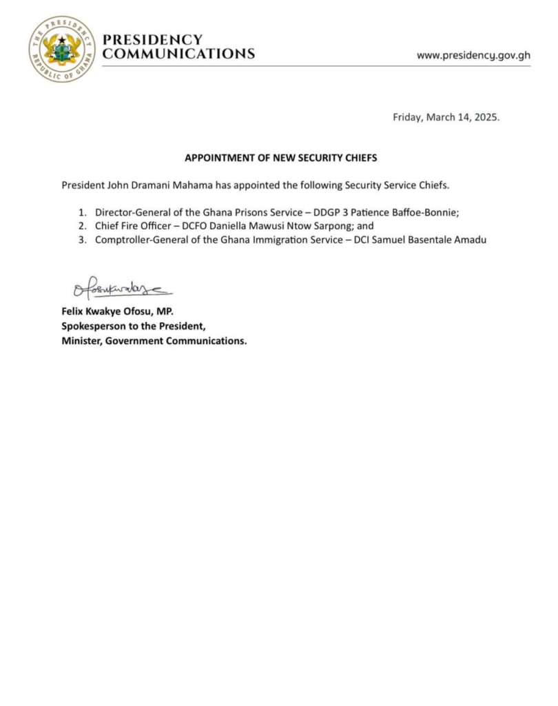 President John Dramani Mahama has made new appointments to the Ghana Immigration Service, the Ghana National Fire Service (GNFS) and the Ghana Prisons Service.