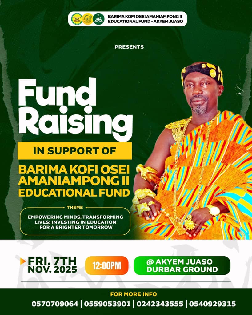 The Barima Kofi Osei Amanianpong II Educational Fund has once again taken center stage at Akyem Juaso, as the traditional council and residents gathered for a grand fundraising event held on Friday, November 7, 2025, at the Akyem Juaso Durbar Grounds.