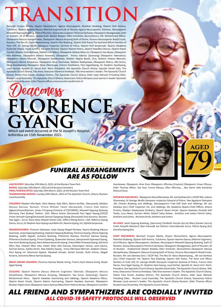 “We Are Grateful For Your Presence And Support At The final Funeral Rites Of The Late Deaconess Florence Ayimaa Botwe” – Dr Gyan and Family
